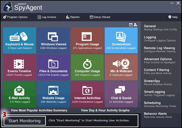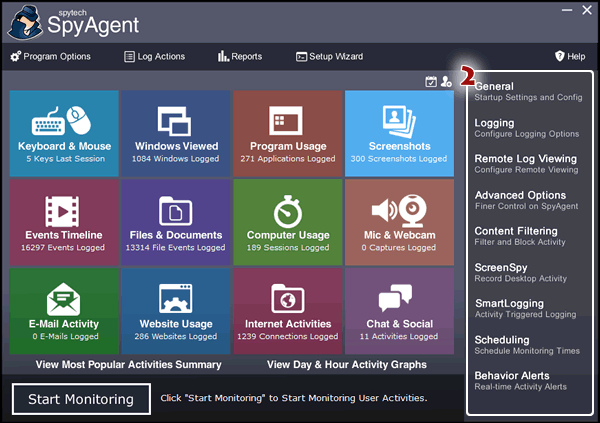Note: If configured to run in stealth mode, SpyAgent's monitoring button will always show "Start Monitoring" when you bring it out of stealth mode with its hotkeys/nostealth.exe, as this stops monitoring in order to reveal the SpyAgent interface.