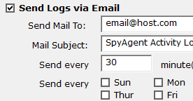 To setup email log delivery click on 'REMOTE LOG VIEWING' on the right side of the SpyAgent interface, then 'Email Log Delivery' in the options screen that appears. In the email delivery settings check 'Send Logs via Email'. Now, enter your email address into the 'Send Mail To" field to have log reports sent there. You can choose what logs you want sent to you, and how often.