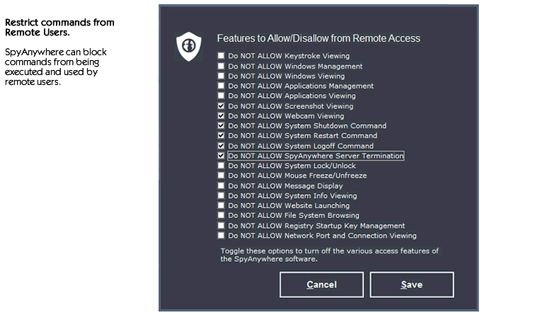 SpyAnywhere allows you to configure what remote options you can access through your web-browser. You can disable any features of your choosing. screenshot